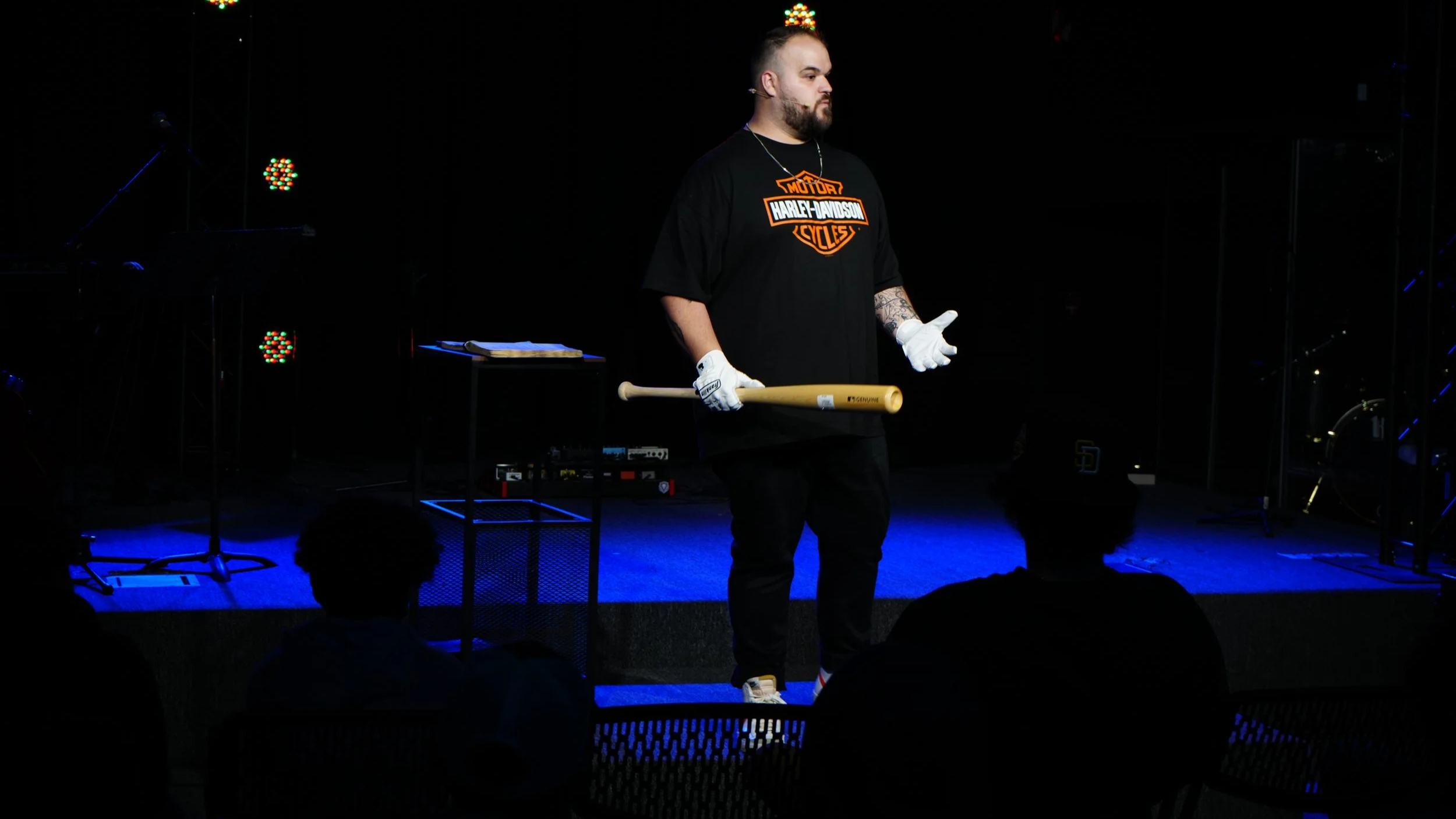 When schools book Let’s Talk Assembly with Tim Smith, they can expect an unforgettable experience that captures students’ attention from start to finish. Tim combines powerful storytelling with high-energy feats of strength—like breaking baseball bats, ripping license plates, and even rolling up frying pans with his bare hands—to instantly engage the audience and keep students on the edge of their seats.